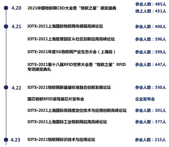 專業的高峰論壇,將會聚焦一個垂直細分話題的代表企業與行業觀眾群體,更好的促進行業的交流。2021年IOTE 2021第十四屆國際物聯網展·上海站舉辦十場不同主題的高峰論壇,上百位演講嘉賓圍繞RFID、傳感器、定位、5G、物聯網、云平臺、智慧園區/社區、工業等領域,講市場現狀及未來趨勢,以及最新產品應用到市場的化學反應! 而IOTE 2022 第十七屆國際物聯網站·上海站,也將圍繞物聯網不同領域,舉辦10場+高峰論壇,請敬請期待!