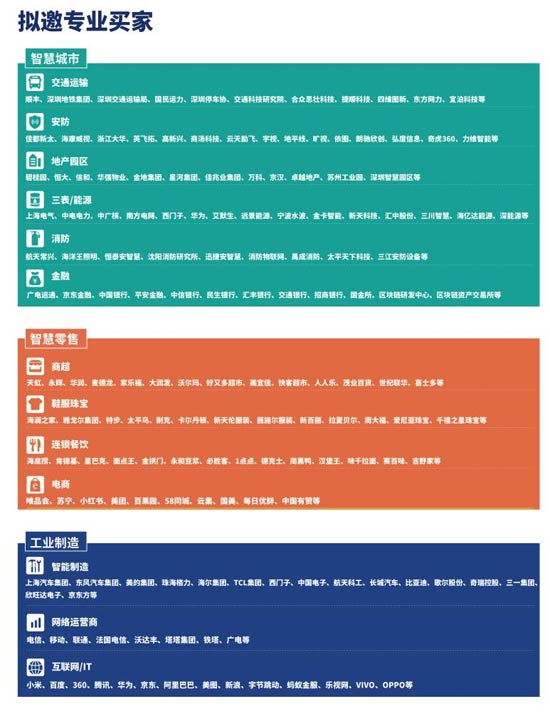 3、完整產業鏈,采購更容易。涵蓋物聯網感知層、網絡傳輸層、運算與平臺層、應用層。還有以應用集成導向的同期展,聚焦:5G、新基建、智慧城市、工業物聯網、等物聯網核心應用,一站式展示物聯網產業最新技術、產品、方案、企業。