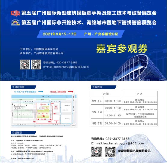 由中國模板腳手架協會主辦,廣州市博展展覽有限公司承辦的第五屆廣州國際新型建筑模板腳手架及施工技術與設備展覽會(以下簡稱廣州模架展)將于9月15-17日在廣州廣交會展館B區舉行。同期舉行第五屆廣州國際非開挖技術海綿城市暨地下管線管廊展覽會。