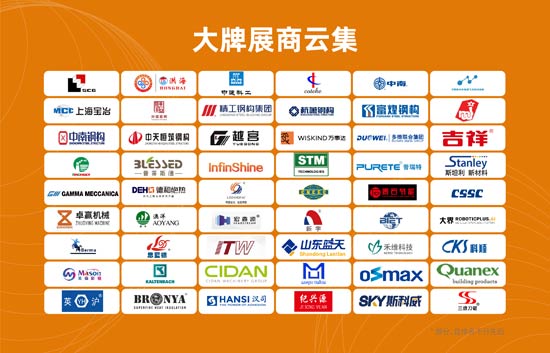 遼寧洪海、天津中辰、陽煤集團、上海中南、澳洋保溫、斯帝姆、華陸、上海煬和、杭蕭鋼構、山東萬事達、山東宏鑫源、多維聯合、寶都國際、藍天板業、鋼之杰、天津新宇、美國ITW-依工建筑、常州卓贏、邯鄲興諾、泉州東辰、安徽紀興源、普萊斯德、上海吉祥、邯鄲理想、蓋馬美凱尼卡、中船重工第七〇二所、斯科威、徐州和成、常州英來、杭州業伊、天意機械、中天海諾、常州金源、浙江久石、山東玉輝、江蘇澤建、山東俏工匠、中原思藍德高科、美國Quanex(柯耐士)、上海邁聯、重慶禾維、世銳建筑、翔盛緊固件、卡巴赫機械、銳泰建筑、澳泰防水、龍禹船舶、中建科工、中南建設集團、精工鋼構、上海寶冶等業內知名企業將各自攜旗下產品和設備參加。各家展商依托此次展會行業平臺,向廣大經銷代理商、建筑工程公司、建筑設計院、建筑研究院所、房地產開發商、電力及石化工程公司、政府機構和行業組織等領域的行業用戶進行展示推廣。