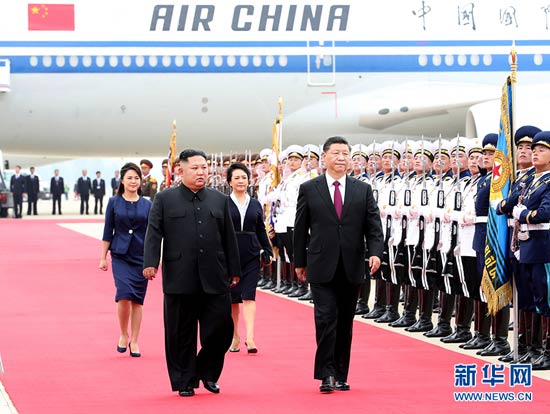 6月20日,中共中央總書記、國家主席習近平乘專機抵達平壤,開始對朝鮮民主主義人民共和國進行國事訪問。朝鮮勞動黨委員長、國務委員會委員長金正恩和夫人李雪主到機場熱情迎接習近平和夫人彭麗媛。朝方在機場舉行隆重歡迎儀式。 新華社記者 黃敬文 攝