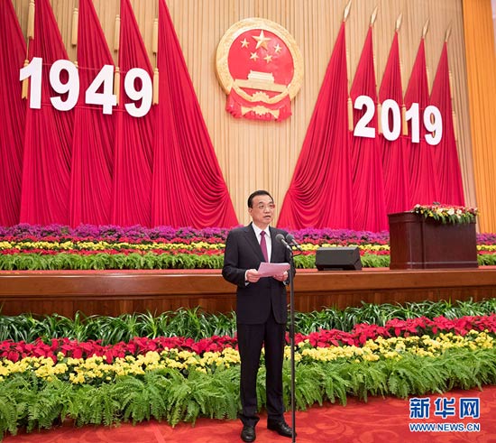 9月30日晚,慶祝中華人民共和國成立70周年招待會在北京人民大會堂隆重舉行。中共中央政治局常委、國務院總理李克強主持招待會。 新華社記者 黃敬文 攝