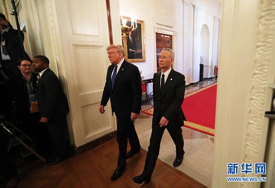 當(dāng)?shù)貢r間1月15日上午,中共中央政治局委員、國務(wù)院副總理、中美全面經(jīng)濟對話中方牽頭人劉鶴(右)與美國總統(tǒng)特朗普抵達(dá)華盛頓白宮東廳,準(zhǔn)備參加中美第一階段經(jīng)貿(mào)協(xié)議簽署儀式。 新華社記者 王迎 攝