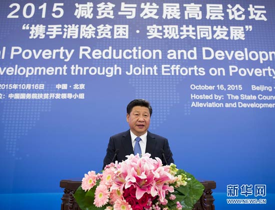 2015年10月16日,習(xí)近平在北京出席2015減貧與發(fā)展高層論壇并發(fā)表題為《攜手消除貧困 促進(jìn)共同發(fā)展》的主旨演講,強(qiáng)調(diào)消除貧困是人類(lèi)的共同使命。改革開(kāi)放30多年來(lái),中國(guó)走出了一條中國(guó)特色減貧道路。中國(guó)在致力于自身消除貧困的同時(shí),積極展開(kāi)南南合作,同舟共濟(jì),攻堅(jiān)克難,支持和幫助廣大發(fā)展中國(guó)家特別是最不發(fā)達(dá)國(guó)家消除貧困,為各國(guó)人民帶來(lái)更多福祉。 新華社記者 李學(xué)仁 攝