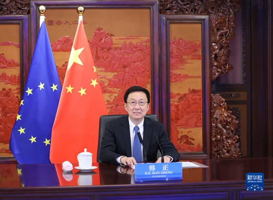 9月27日,中共中央政治局常委、國務院副總理韓正在北京通過視頻方式同歐盟委員會執行副主席蒂默曼斯舉行第二次中歐環境與氣候高層對話。