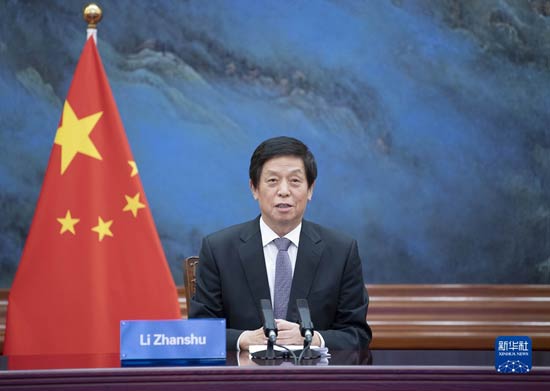 10月27日,全國人大常委會委員長栗戰書在北京人民大會堂以視頻方式同愛爾蘭眾議長奧法喬爾舉行會談。新華社記者 李濤 攝