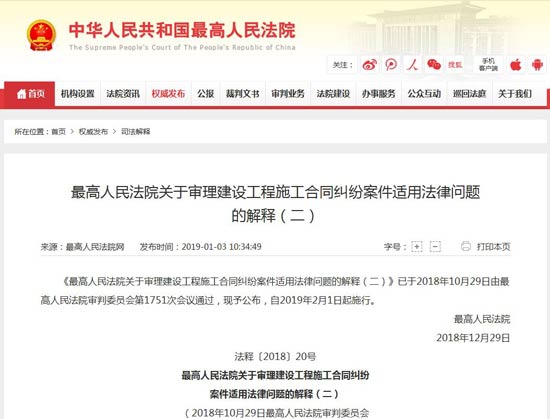 【建設行業.報道】近日,最高人民法院發布《關于審理建設工程施工合同糾紛案件適用法律問題的解釋(二)》。《解釋》經最高人民法院審判委員會第1751次會議討論通過,將于2019年2月1日起施行。針對近年來建筑市場的新變化、司法實踐的新問題、管理政策的新突破,《解釋》就建設工程施工合同效力、建設工程價款結算、建設工程鑒定、建設工程價款優先受償權和實際施工人權利保護等問題作了規定。